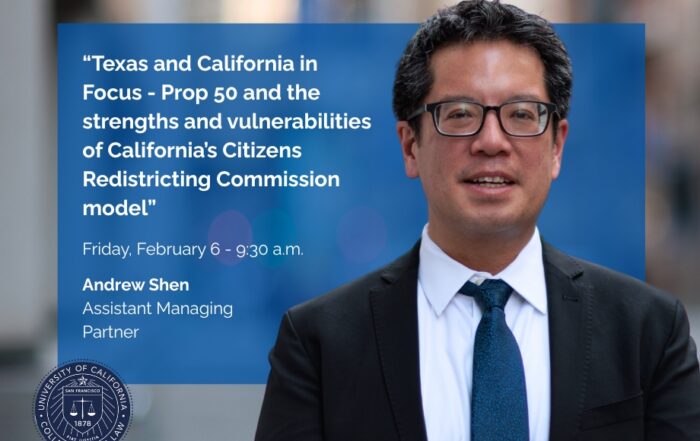 Renne Public Law Group (RPLG) Assistant Managing Partner Andrew Shen will join leading scholars and practitioners at UC Law San Francisco's (UC Law SF) Spring Constitutional Law Quarterly Symposium on Friday, February 6, examining critical issues at the intersection of voting rights and redistricting.